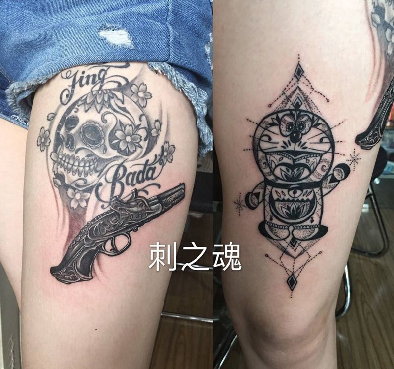 当前位置: 首页 >天津市纹身店-刺之魂艺术纹身纹身图案>枪纹身图片_欧美写实成品腿部纹身图案