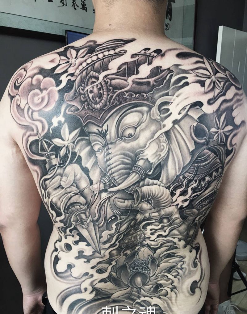当前位置: 首页 >天津市纹身店-刺之魂艺术纹身纹身图案>象神纹身图片_成品背部传统人物原创纹身图案