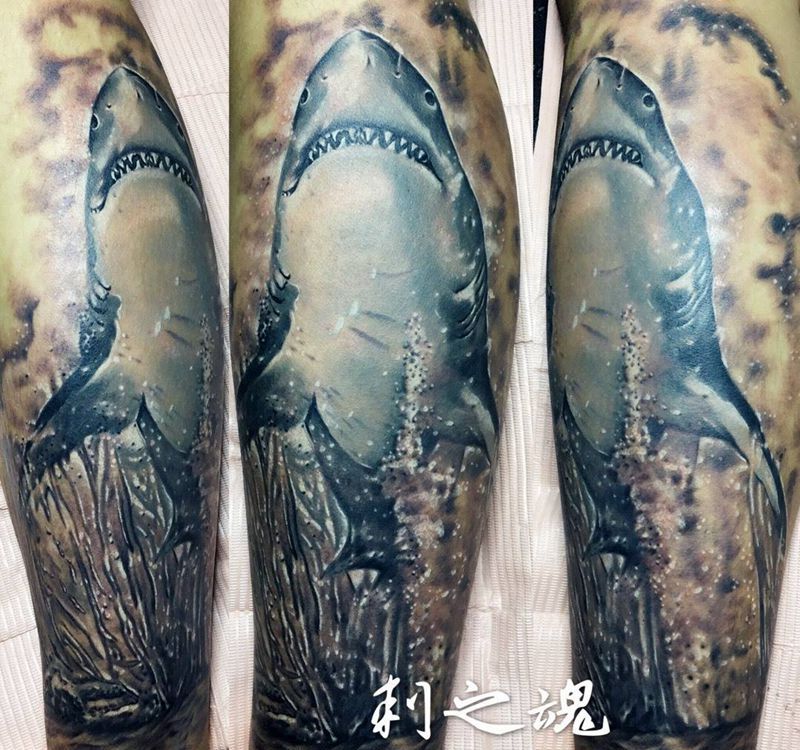 当前位置: 首页 >天津市纹身店-刺之魂艺术纹身纹身图案>大白鲨纹身图片_成品腿部欧美动物原创纹身图案