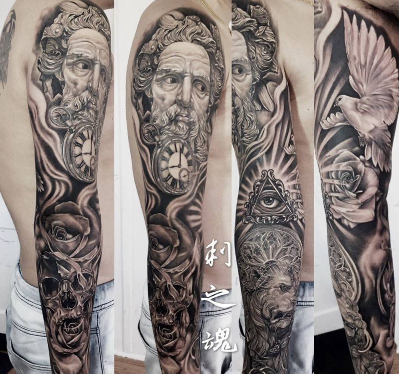 当前位置: 首页 >天津市纹身店-刺之魂艺术纹身纹身图案>海神波塞冬纹身图片_成品手臂欧美人物写实原创宗教纹身图案