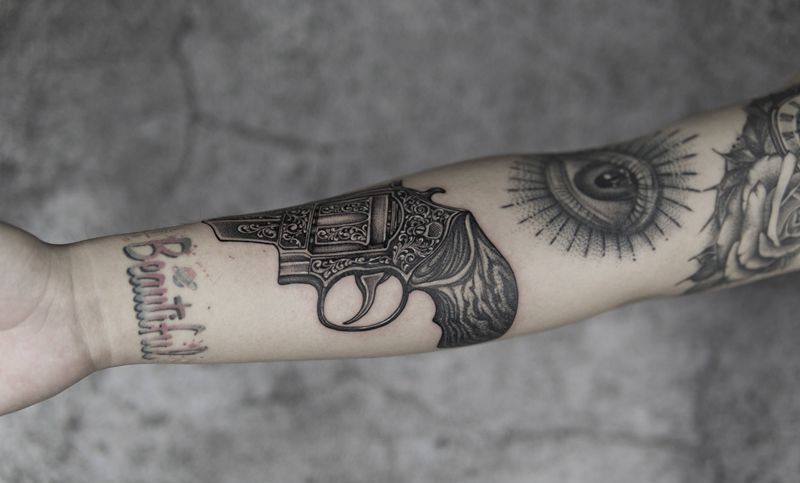 当前位置: 首页 >天津市纹身店-天津山谷刺青纹身图案>手枪纹身图片_手部臀部点刺欧美写实枪手枪左轮纹身图案