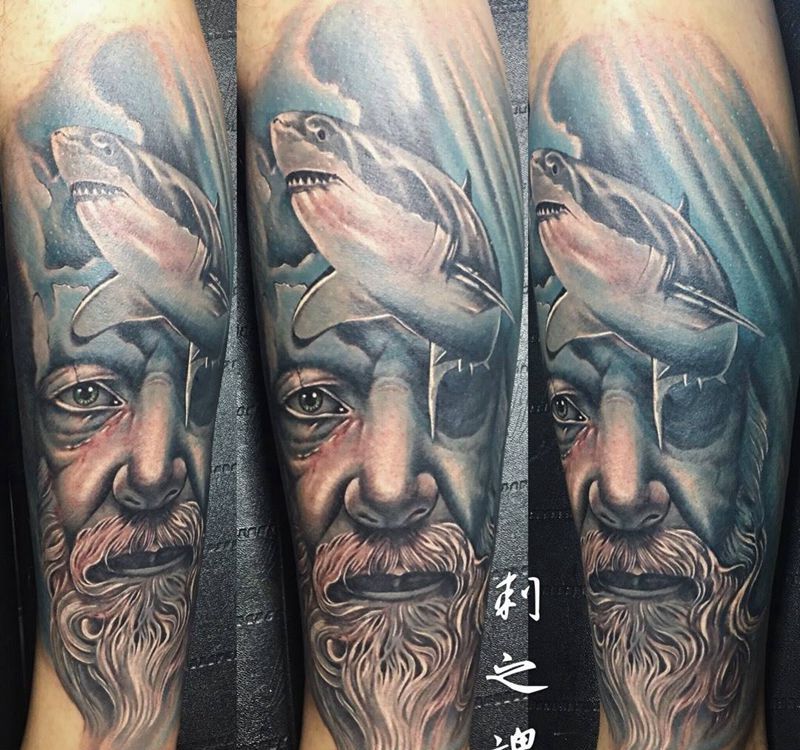当前位置: 首页 >天津市纹身店-刺之魂艺术纹身纹身图案>波塞冬纹身图片_成品腿部欧美写实人物动物原创纹身图案