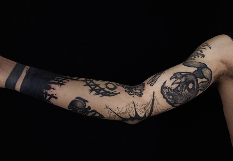 当前位置: 首页 >天津市纹身店-天津山谷刺青纹身图案>暗黑拼接花臂纹身图片_手臂腿部欧美写实花体字暗黑拼接花臂纹身图案