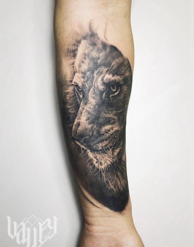 当前位置: 首页 >天津市纹身店-天津山谷刺青纹身图案>黑灰写实狮子纹身图片_手臂欧美写实纹身图案
