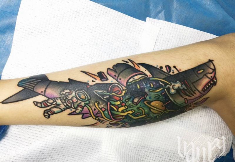 当前位置: 首页 >天津市纹身店-天津山谷刺青纹身图案>机械鲨鱼纹身图片_腿部Old School纹身图案
