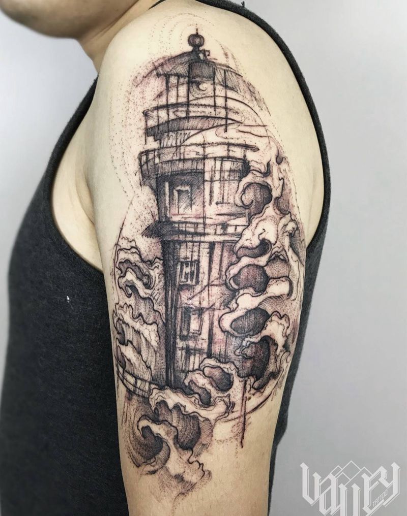 线条灯塔纹身图片_手臂欧美写实纹身图案