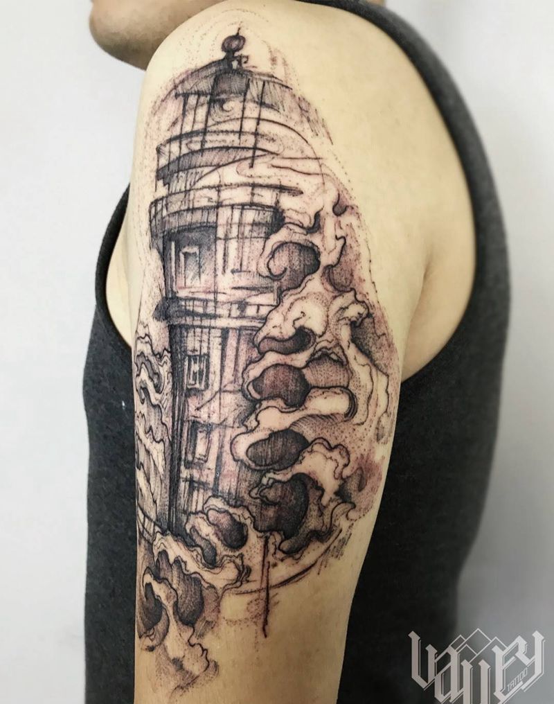 线条灯塔纹身图片_手臂欧美写实纹身图案