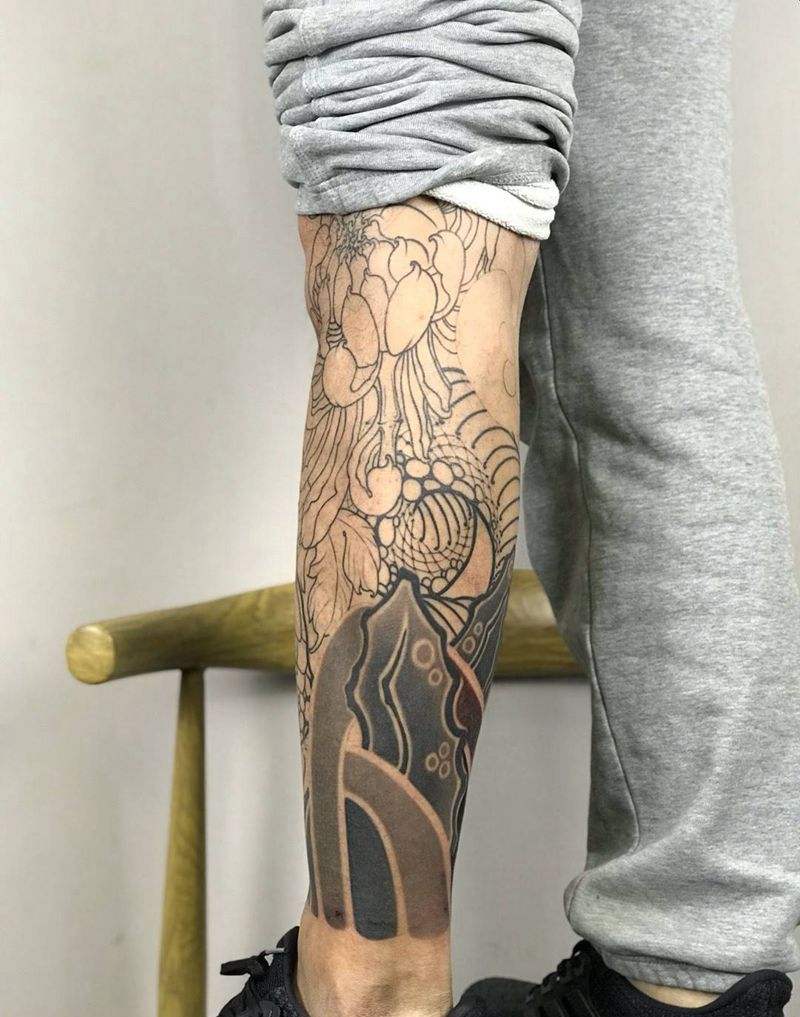 • T网红王老大花腿龙纹身图片_腿部新传统纹身图案