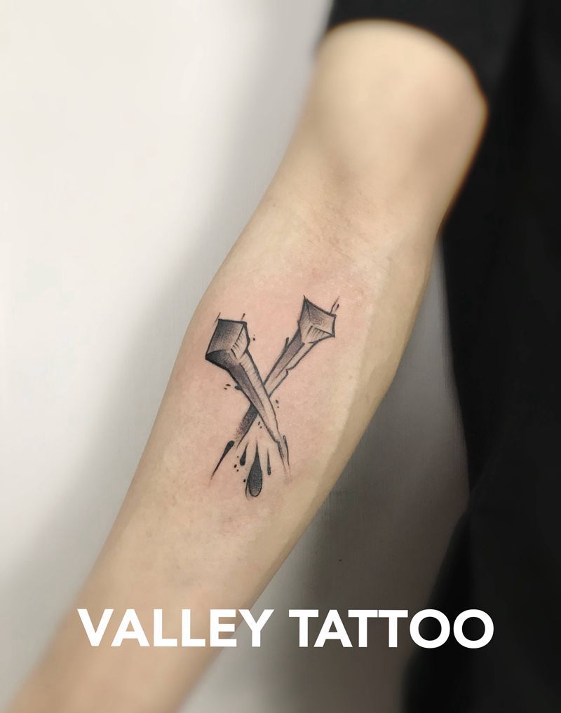 当前位置: 首页 >天津市纹身店-天津山谷刺青纹身图案>钉子纹身图片_手臂欧美写实New School纹身图案