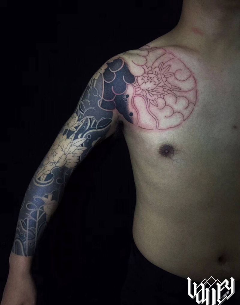 花臂接半胛纹身图片_手臂胸部纹身图案