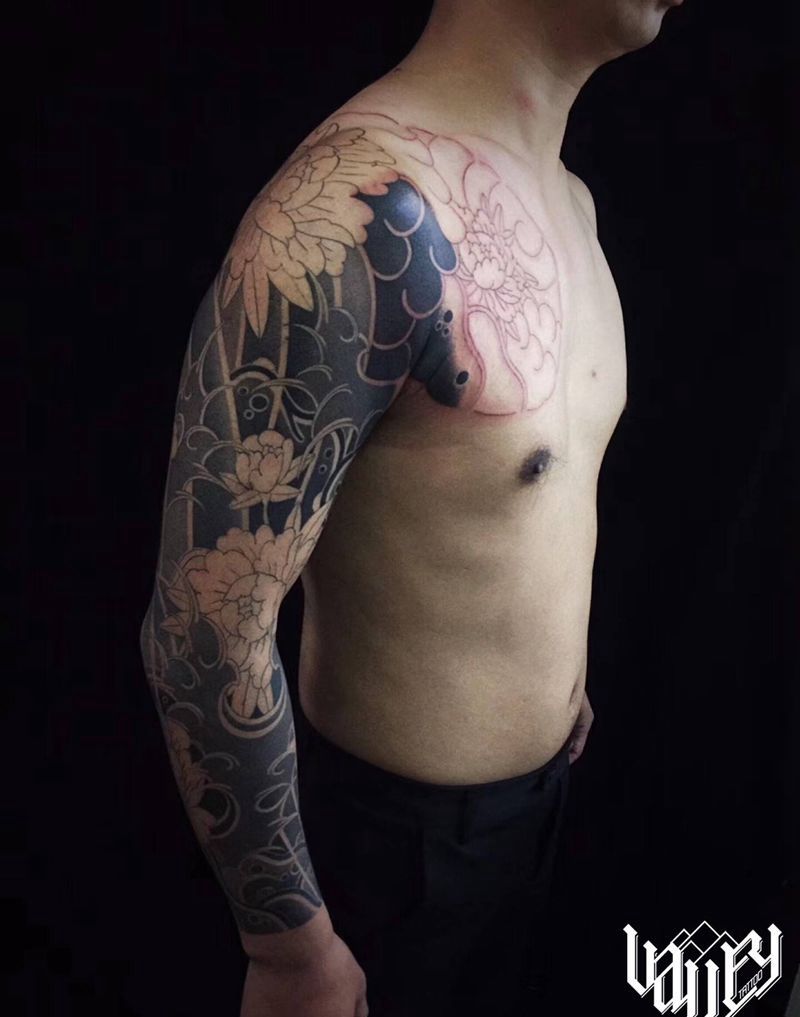 花臂接半胛纹身图片_手臂胸部纹身图案