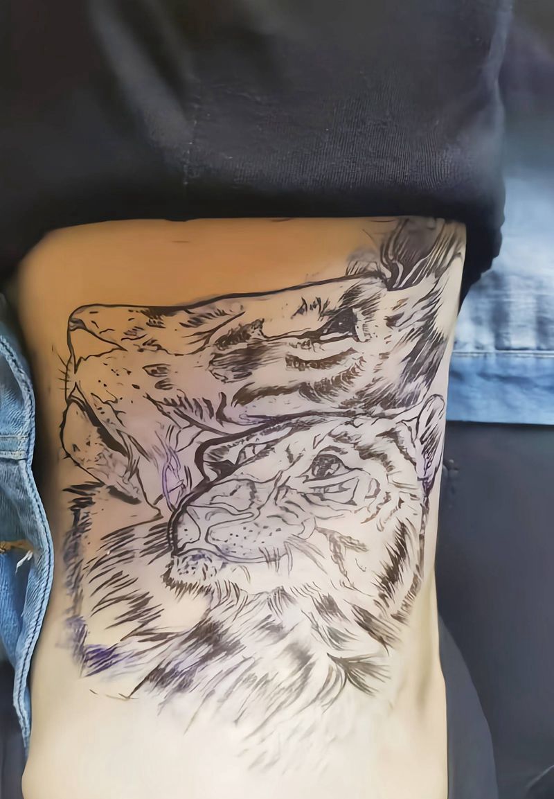 写实狮子纹身图片_腰部欧美写实纹身图案