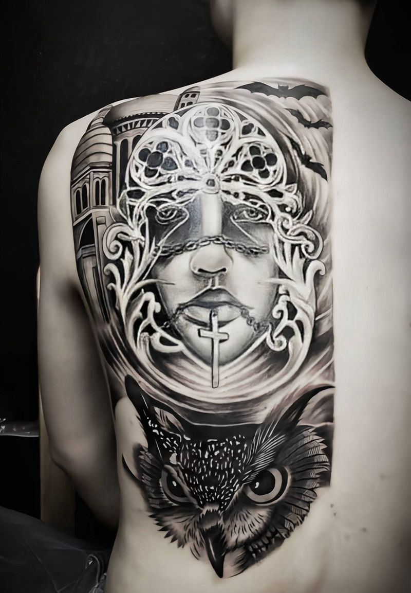 欧美半背,未完工纹身图片_背部欧美写实纹身图案