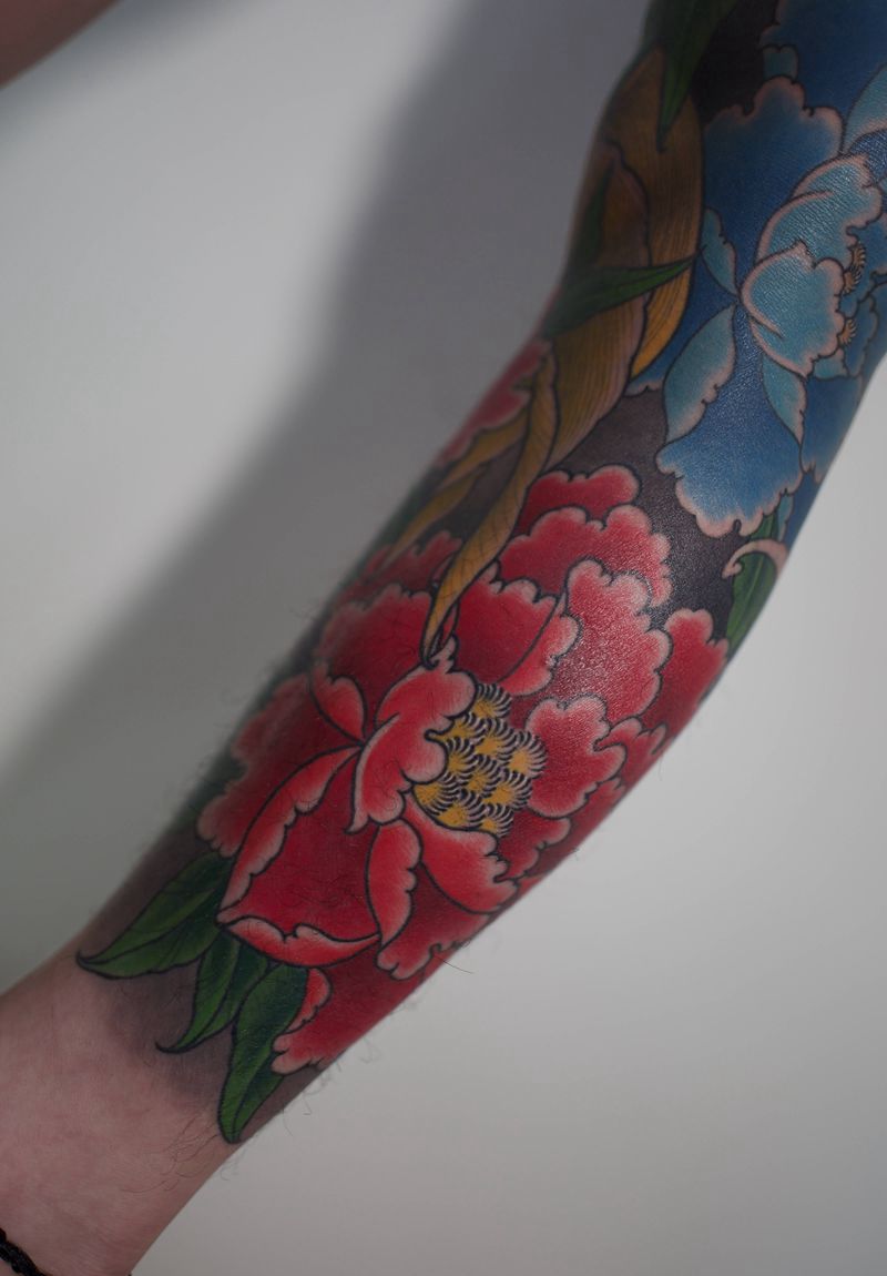 鲤鱼戏牡丹纹身图片_腿部老传统纹身图案
