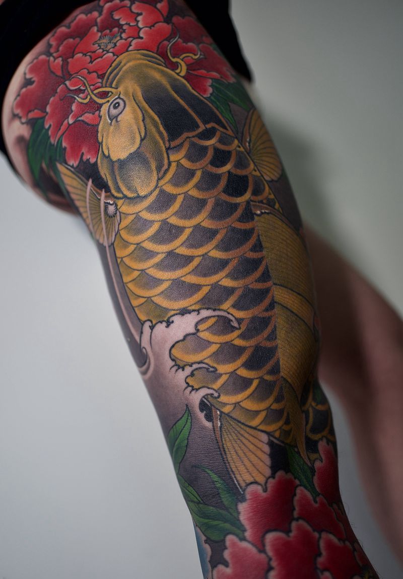 鲤鱼戏牡丹纹身图片_腿部老传统纹身图案