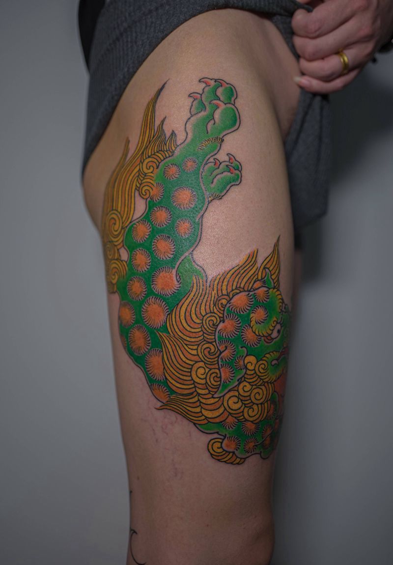 当前位置: 首页 >天津市纹身店-瘾晗刺青潮流店纹身图案>唐狮子纹身图片_腿部老传统纹身图案