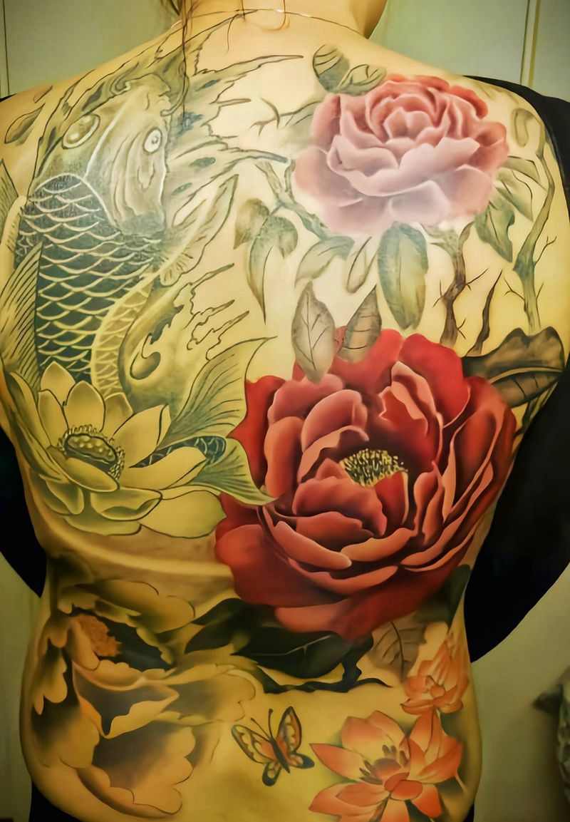 满背添加牡丹,完工纹身图片_背部欧美写实纹身图案