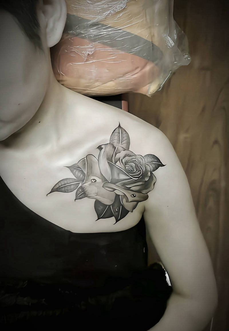 锁骨玫瑰纹身图片_肩部欧美写实纹身图案