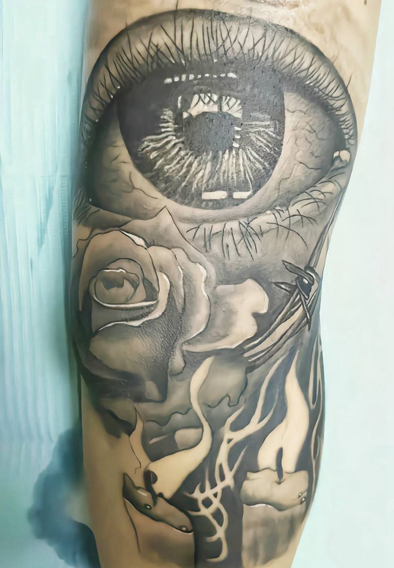 • 手背潮流时尚的玫瑰花眼睛纹身图案