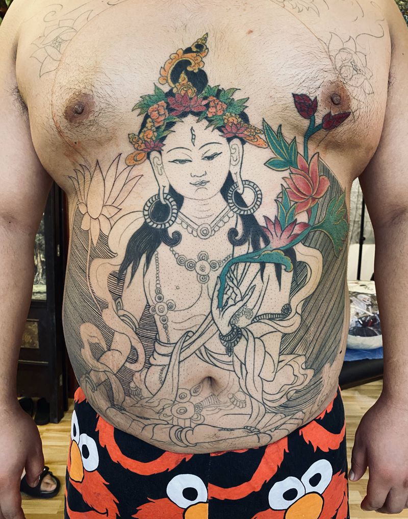度母未完成纹身图片_胸部新传统纹身图案