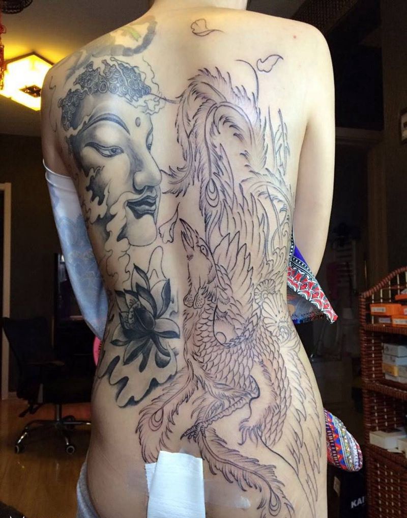 修改后背佛加凤凰改满背凤凰线条以纹身图片_