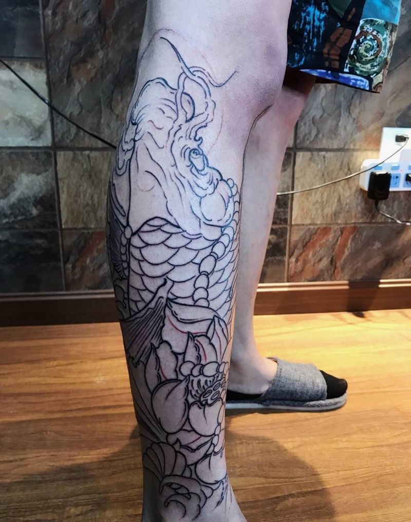 • T网红王老大花腿龙纹身图片_腿部新传统纹身图案