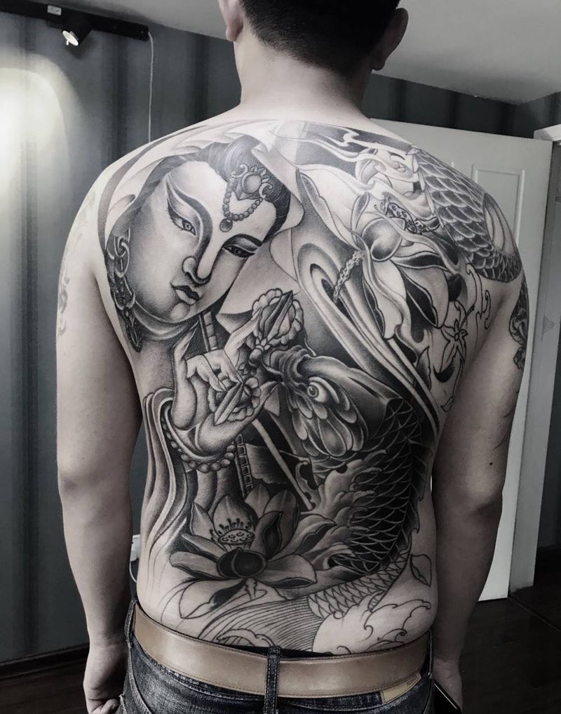 满背观音戏鲤鱼纹身图片_未完成纹身图案