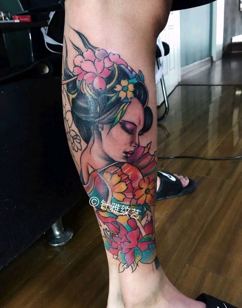 当前位置: 首页 >天津市纹身店-针雅TATTOO纹身图案>小腿艺妓纹身图片_