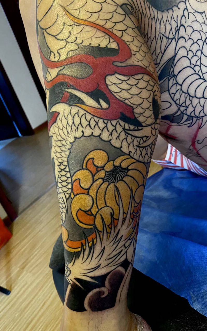 • T网红王老大花腿龙纹身图片_腿部新传统纹身图案