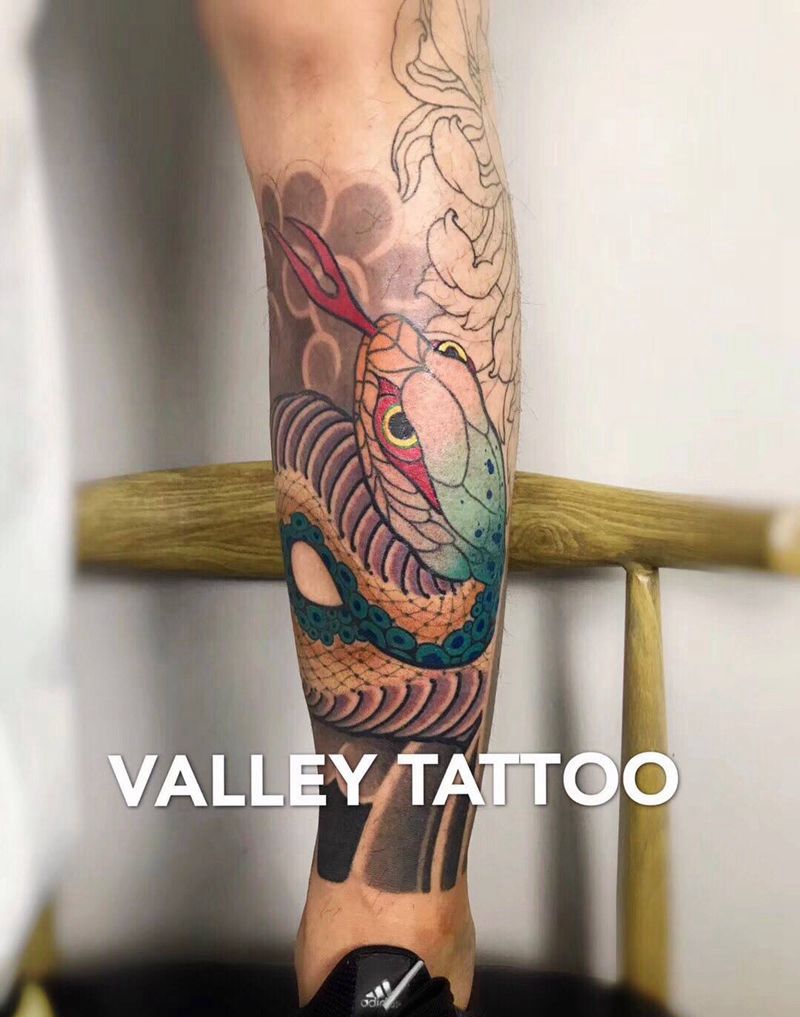 当前位置: 首页 >天津市纹身店-天津山谷刺青纹身图案>蛇纹身图片_腿部老传统Old School纹身图案