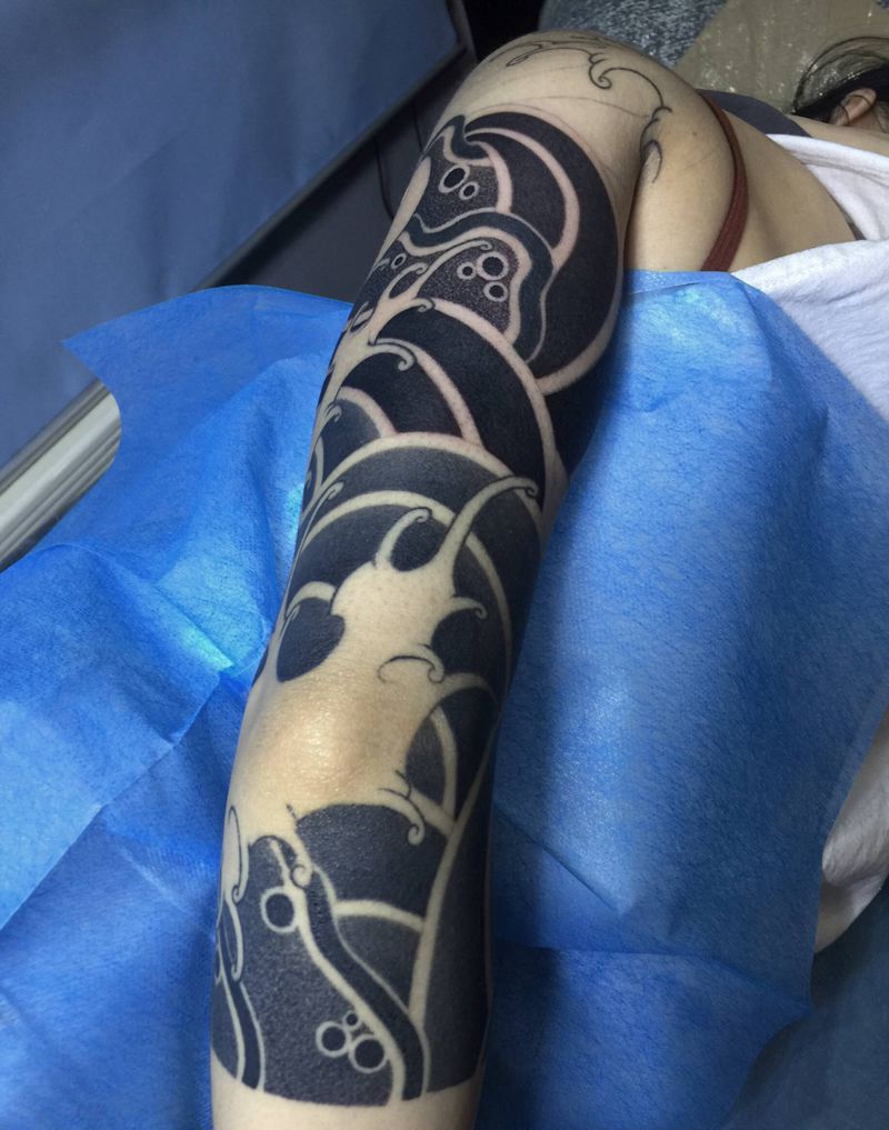 • T网红王老大花腿龙纹身图片_腿部新传统纹身图案