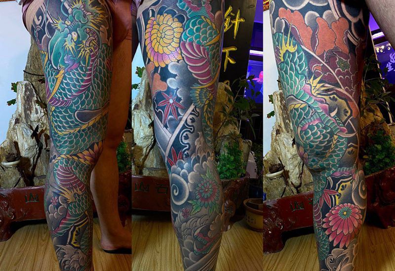 • T网红王老大花腿龙纹身图片_腿部新传统纹身图案