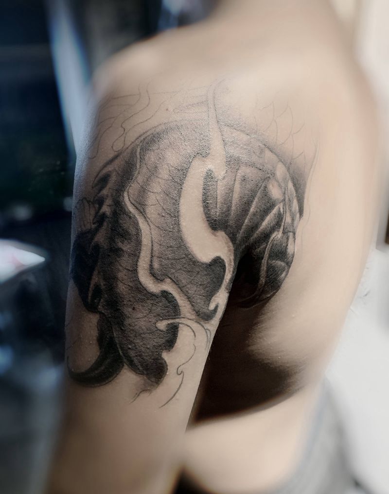 龙 割线未完纹身图片_肩部胸部新传统纹身图案