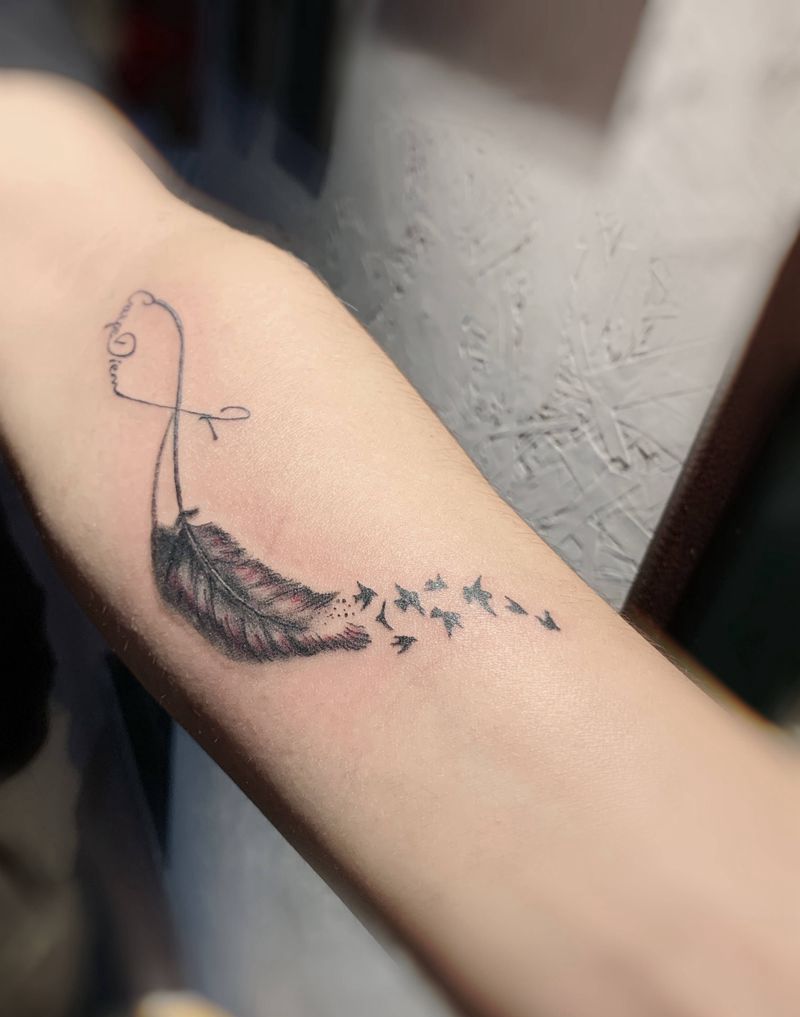 当前位置: 首页 >天津市纹身店-之余刺青纹身图案>羽毛+小飞鸟纹身图片_手臂纹身图案