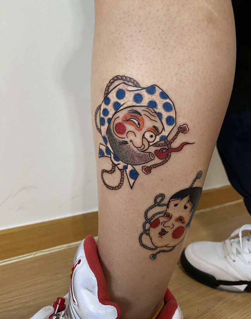 日式纹身图片_腿部新传统阿多福火男纹身图案