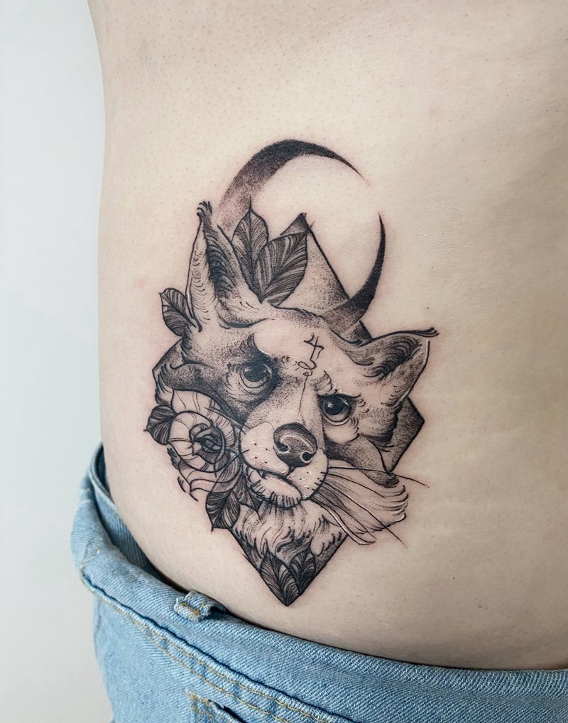 当前位置: 首页 >天津市纹身店-瘾晗刺青潮流店纹身图案>狐狸纹身图片_腰部几何New School狐狸速写纹身图案