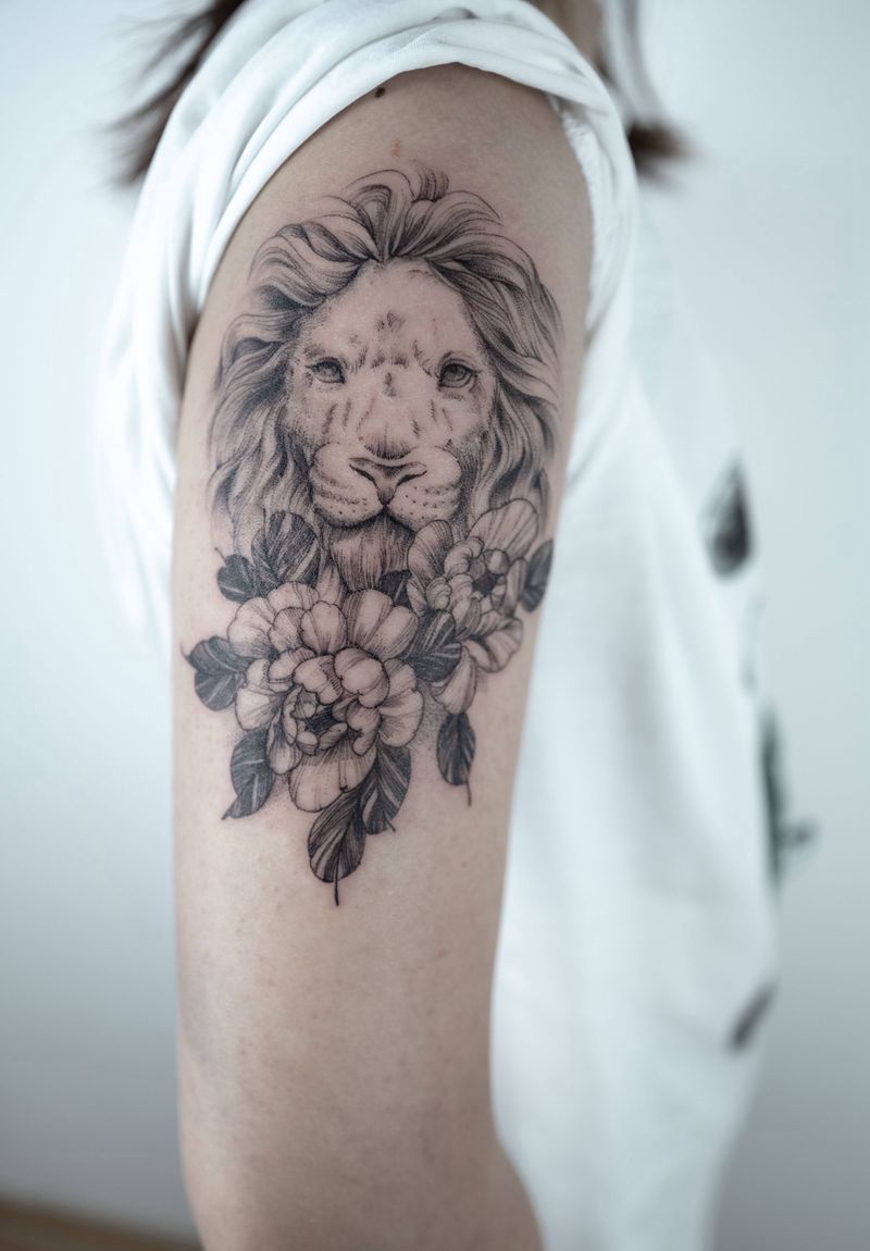 狮子素花纹身图片_手臂点刺清新纹身图案