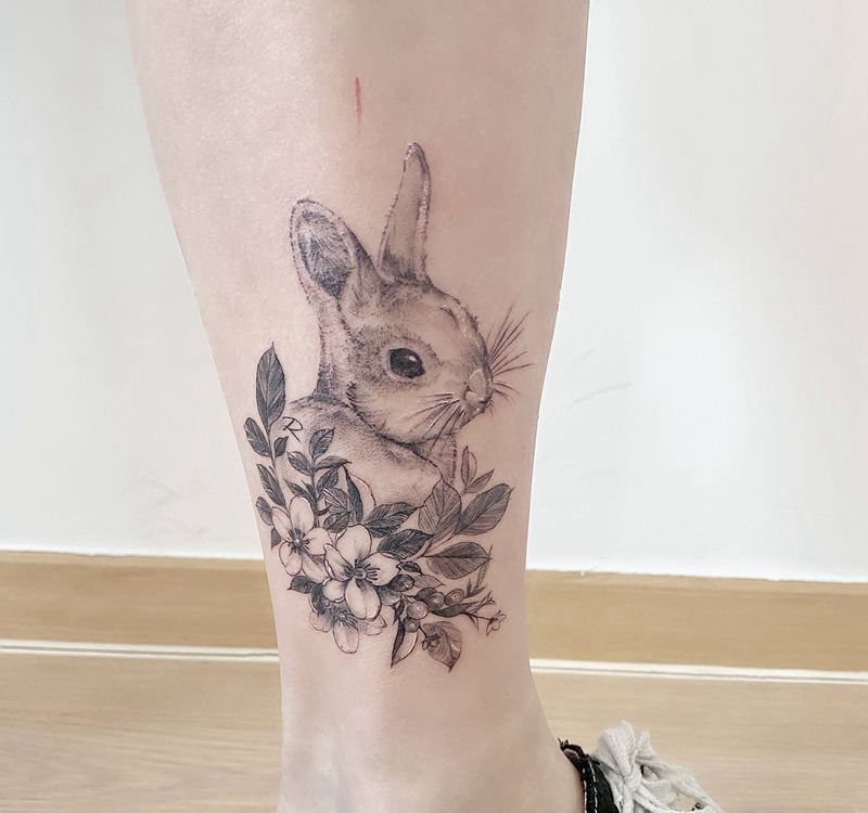 当前位置: 首页 >天津市纹身店-瘾晗刺青潮流店纹身图案>小兔纹身图片_腿部点刺兔子花清新纹身图案