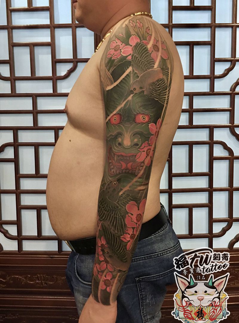 般若花臂纹身图片_手臂新传统纹身图案
