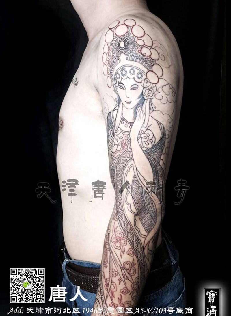 当前位置: 首页 >天津市纹身店-唐人刺青纹身图案>青衣花臂割线完成纹身图片_