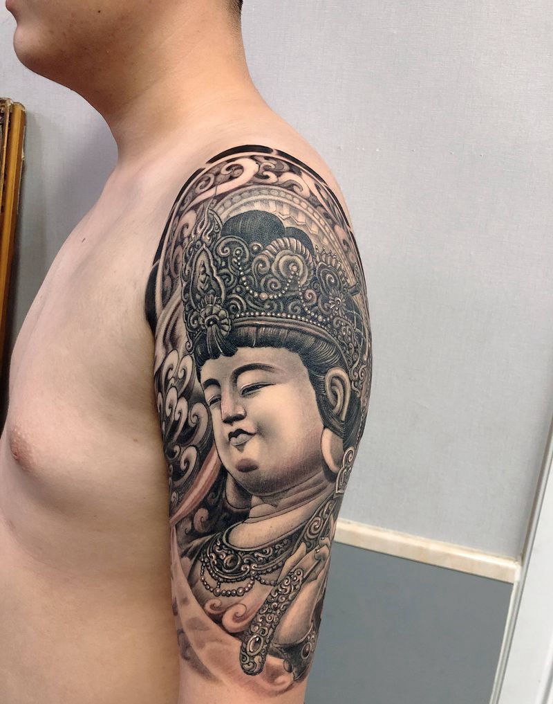 文殊菩萨纹身图片_肩部手臂新传统水墨纹身图案