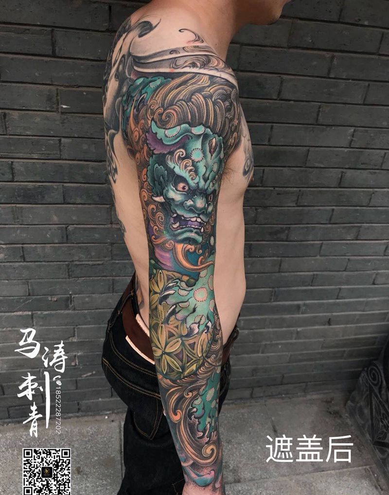 当前位置: 首页 >天津市纹身店-马涛刺青纹身图案>唐狮花臂纹身图片_手臂肩部新传统水彩纹身图案