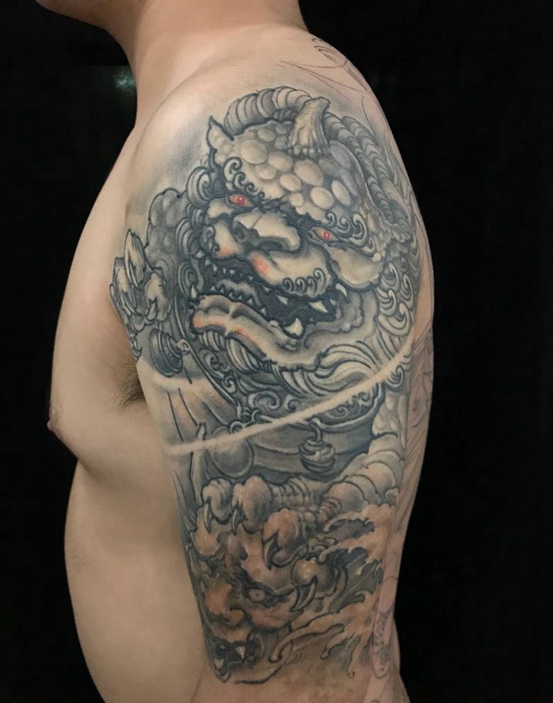 唐狮纹身图片_肩部手臂传统成品纹身图案