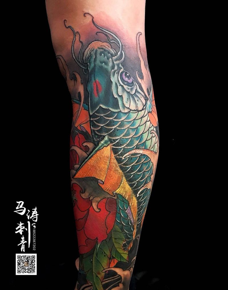 鱼遮盖作品纹身图片_成品腿部动物传统纹身图案