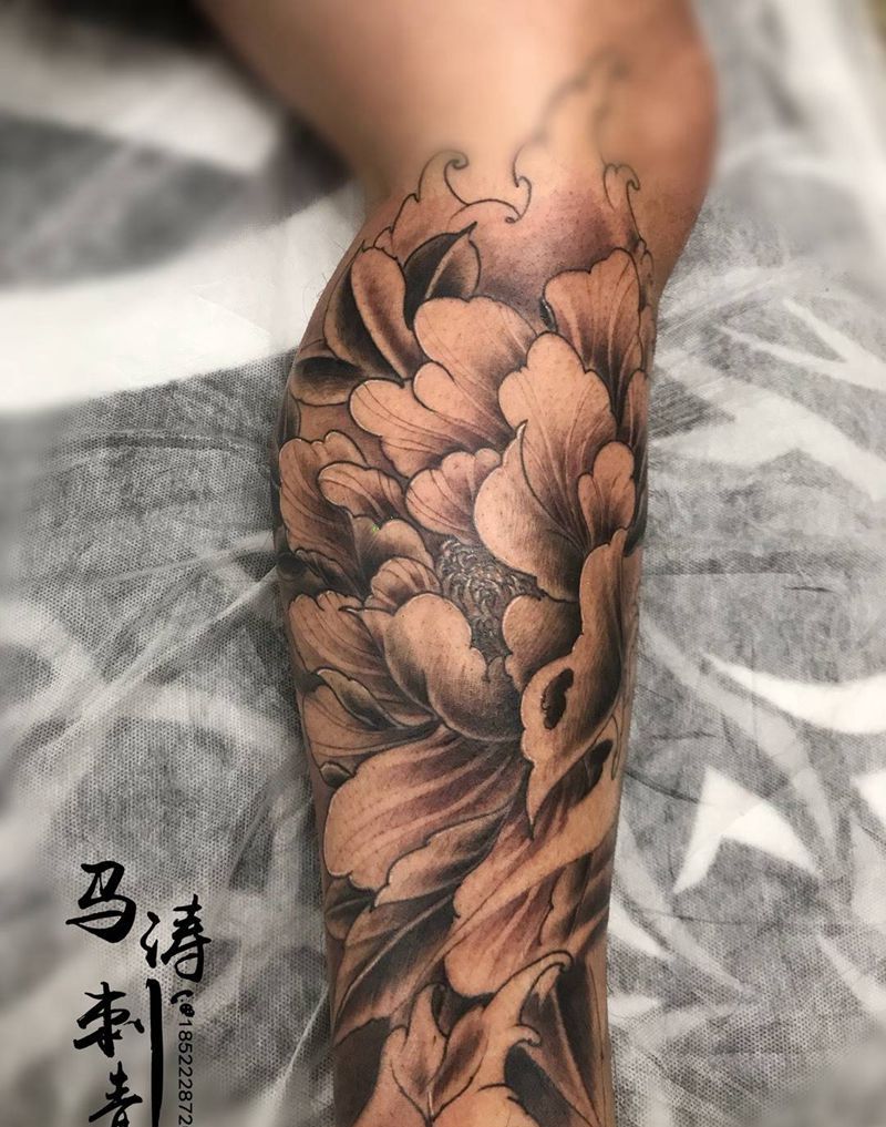 牡丹花纹身图片_成品手稿原创传统腿部纹身图案