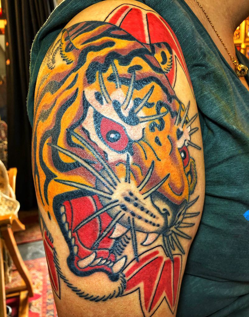 当前位置: 首页 >天津市纹身店-同義誠刺青處纹身图案>大老虎纹身图片_肩部老传统纹身图案