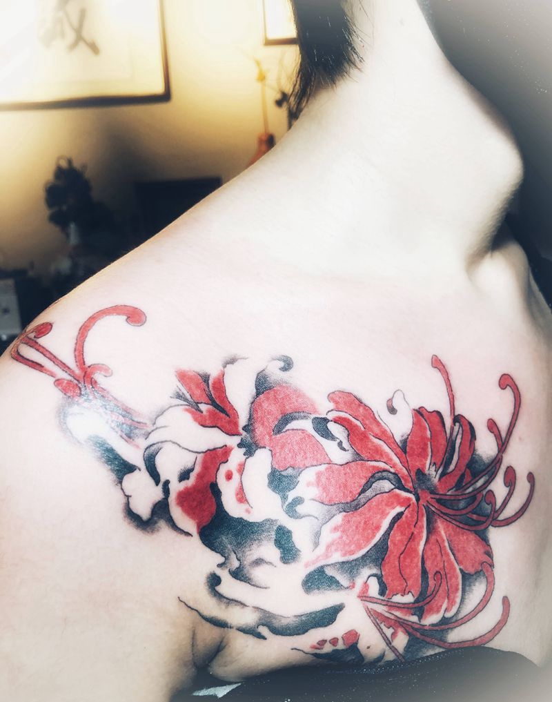 当前位置: 首页 >天津市纹身店-同義誠刺青處纹身图案>彼岸花纹身图片_胸部水墨水彩纹身图案