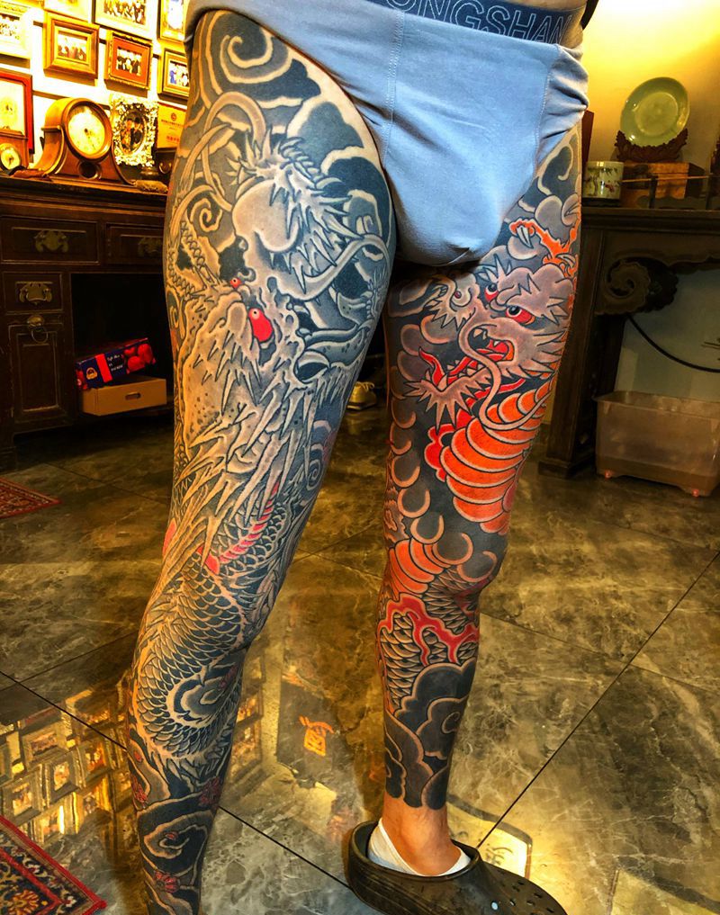 • T网红王老大花腿龙纹身图片_腿部新传统纹身图案