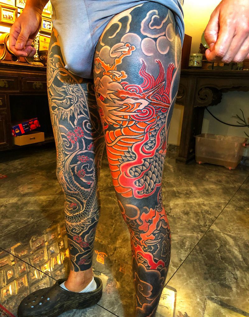 • T网红王老大花腿龙纹身图片_腿部新传统纹身图案