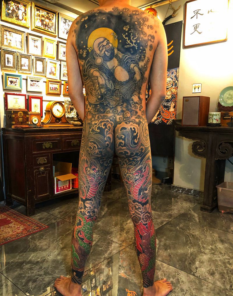 当前位置: 首页 >天津市纹身店-同義誠刺青處纹身图案>通體刺青纹身图片_背部腿部老传统水墨纹身图案